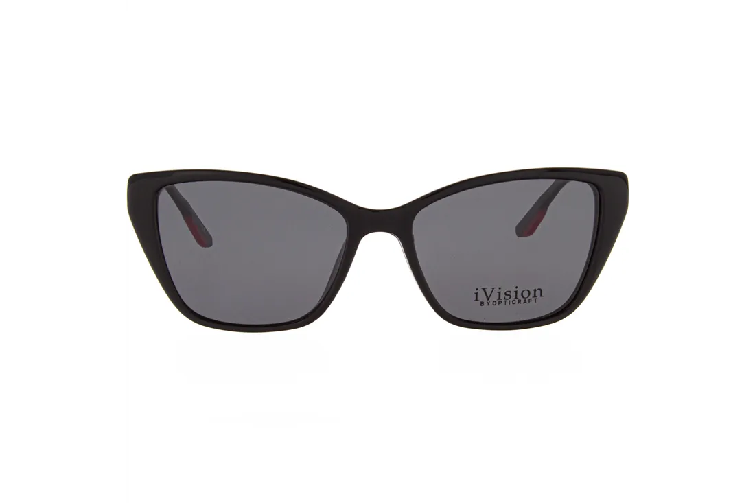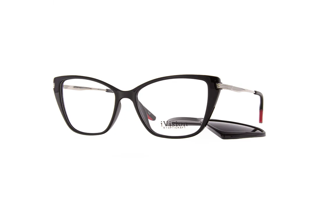 The Ivision Clip-on women's eyewear features a full-rim design with a black front frame and silver-black temples, ensuring durability and comfortable wear. The polarized, UV-filtering gray clip-on lenses provide effective protection against harmful light effects while remaining compatible with various optical lenses. The clip-on system's ease of use makes it ideal for optical retailers where quality and functionality are paramount.