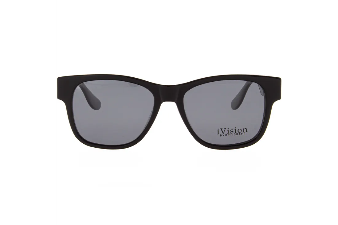 The Ivision by Opticraft clip-on glasses feature a premium-quality plastic front frame with a full-rim design in black. Their angular shape is compatible with gray polarized lenses as well as yellow UV-filtering lenses designed to enhance driving comfort. The durable and lightweight construction is ideal for optical retailers where both functionality and style are paramount. The practical clip-on system allows for quick interchange of sunglasses, ensuring comfortable wear under varying light conditions.