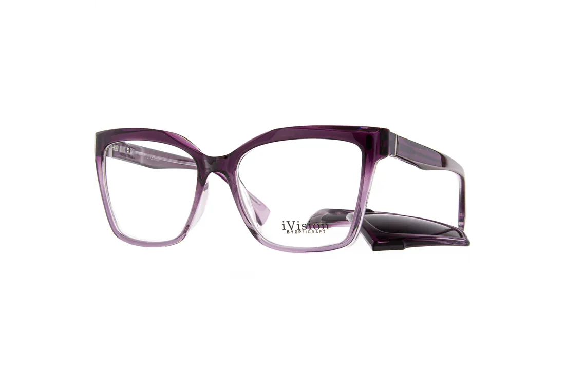 The Ivision by Opticraft clip-on glasses represent an excellent choice for modern female consumers who value both fashionable appearance and practical use. The purple, translucent plastic front frame and temples feature an elegant butterfly shape that not only offers aesthetic appeal but also ensures comfortable wear, while the full-rim design guarantees stability and durability. This model is also ideal as an optical frame compatible with prescription lenses, making it widely applicable for various vision correction needs.
