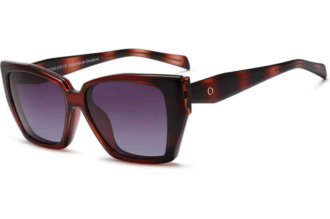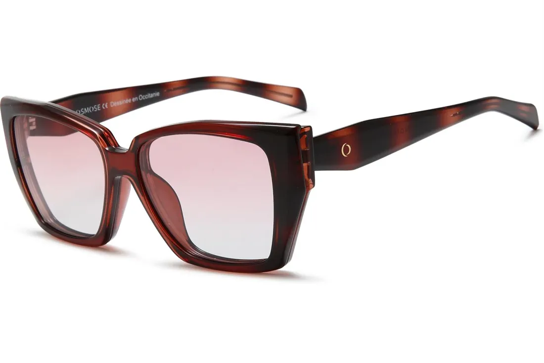 Featuring two clip-on lenses, one with a brown gradient and the other with a pink gradient, these glasses provide adaptable options for different lighting conditions. Both lenses are polarized and equipped with a UV filter, ensuring excellent protection against glare and harmful sun rays. The brown temples match the frame, creating a cohesive and fashionable appearance.