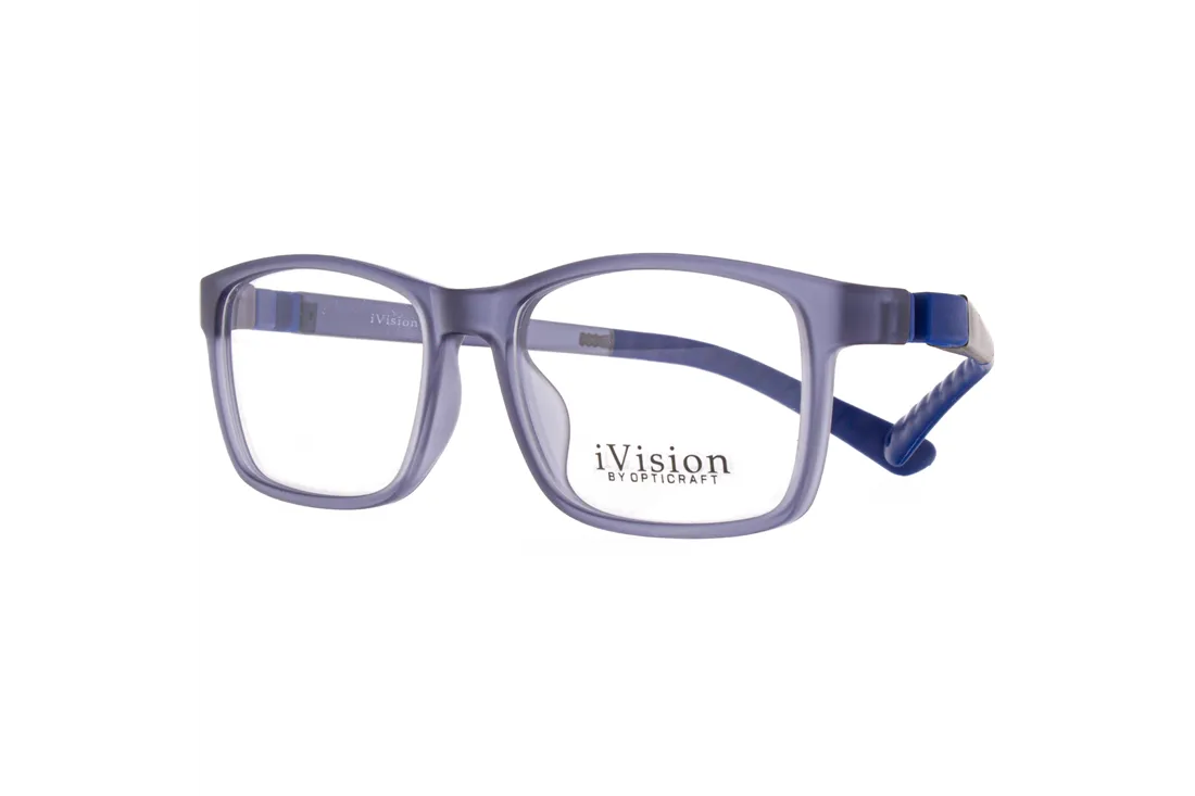 The Ivision frame offers a perfect blend of style and comfort for young wearers. Crafted from lightweight plastic, this gray front frame is designed to be both sturdy and gentle on sensitive skin. Its angular shape adds a modern touch, making it a fashionable choice for kids.