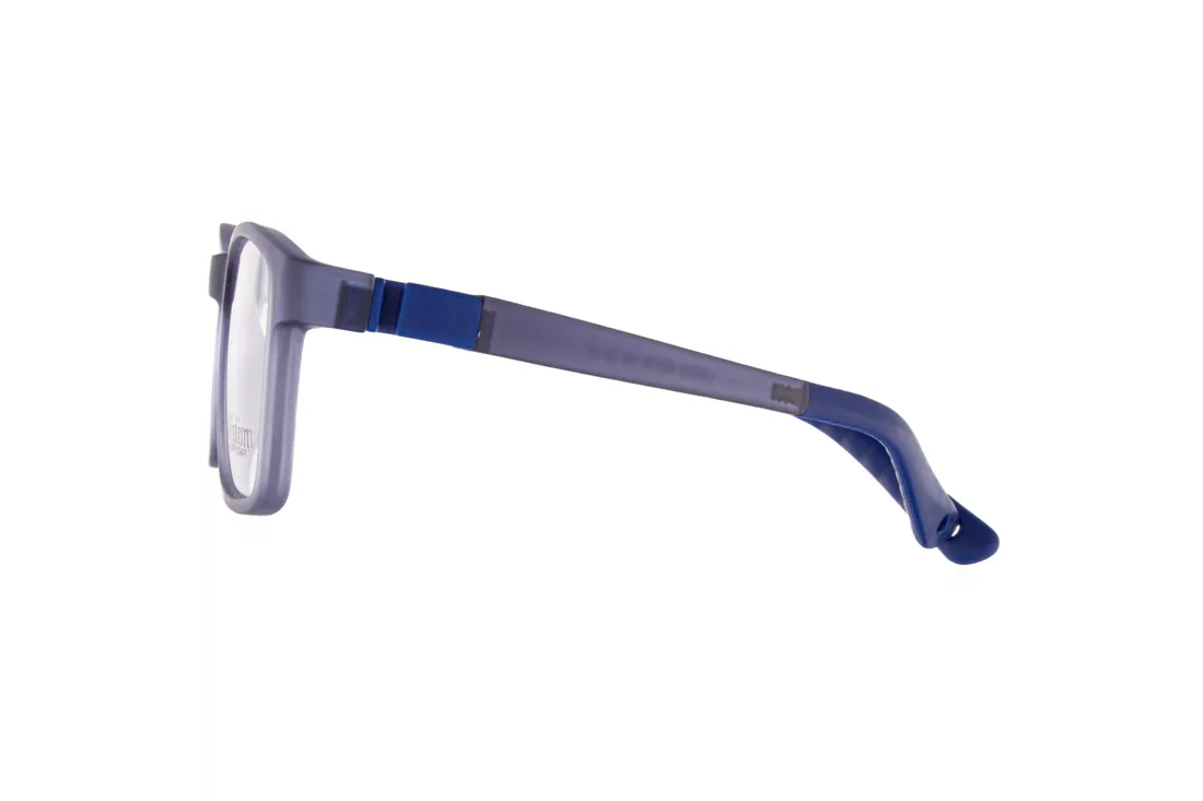 The temples feature a unique combination of blue and gray colors, adding a playful yet sophisticated look. The round frame type ensures a comfortable fit, while the carefully measured bridge and temple sizes provide stability during active play. Ideal for everyday use, this frame supports clear vision with a design that keeps up with a child’s busy lifestyle.