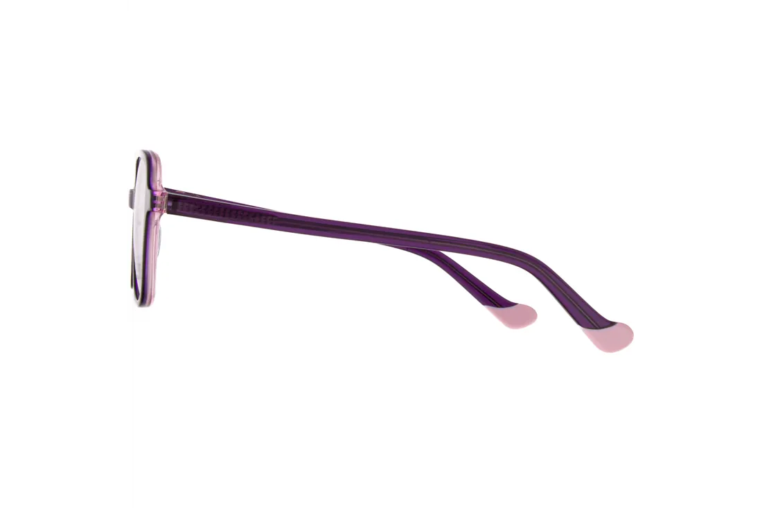 The Ivision by Opticraft eyewear represents an exceptional quality optical frame designed specifically for children, combining modern geometric aesthetics with practicality. The purple plastic front and matching temples create a harmonious unit that delivers a fresh, youthful appearance. The full-rim design not only enhances visual appeal but also ensures stability and durability, making it an ideal choice for the everyday use of active children.