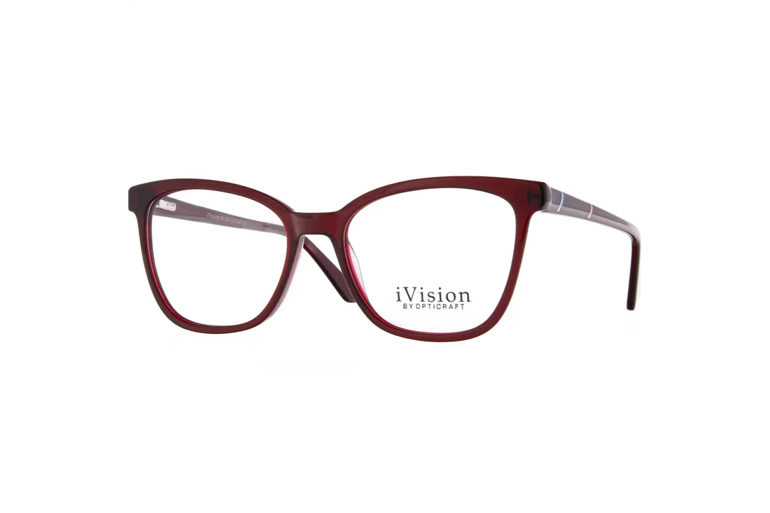 The Ivision by Opticraft eyewear represents a superior quality optical frame designed specifically for children, distinguished by its elegant combination of a burgundy-colored, rounded front and temples. The full-rim design is crafted from durable plastic, ensuring long-lasting performance and resistance to daily wear and tear. This construction is particularly advantageous for active children who require both comfort and durability.