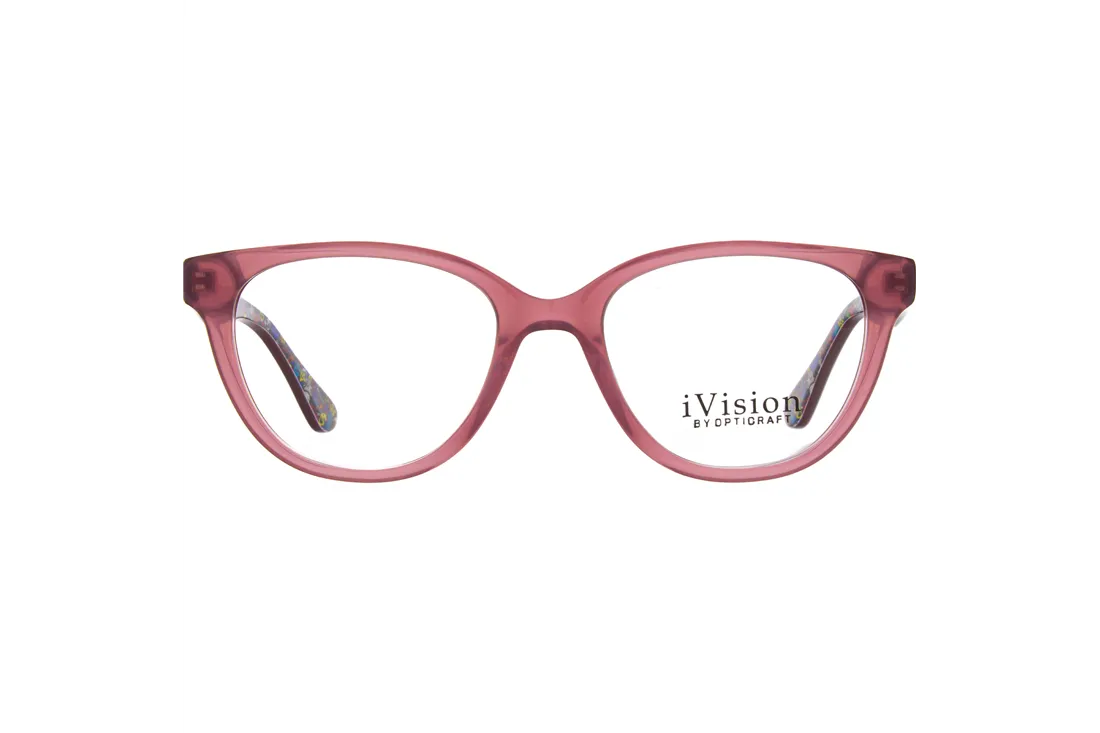 The Ivision by Opticraft eyewear features a high-quality, full-rim optical frame specifically designed for children. The rounded shape of the pink plastic front not only offers an aesthetically pleasing appearance but also ensures comfortable wear for young users. The burgundy temples provide a harmonious contrast, lending the frame a playful yet elegant look.
