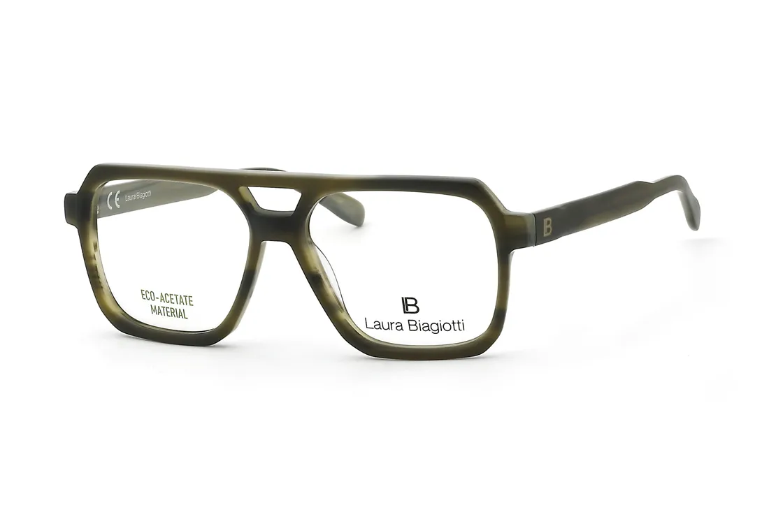 The Laura Biagiotti eyewear is designed for men, featuring a green plastic front frame. Its pilot shape is modern yet timeless. The frame is made from environmentally friendly eco-acetate material, ensuring durability and comfortable wear. It is ideally suited for optical retailers, as it easily accommodates various lens types, making it a practical choice for everyday use.