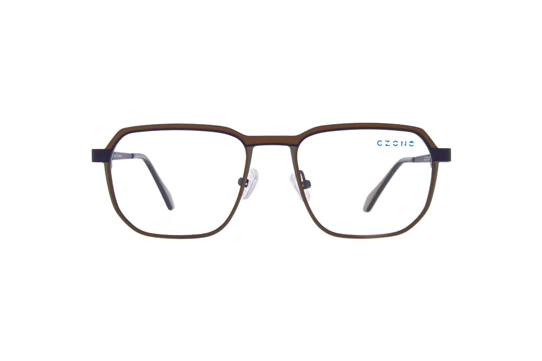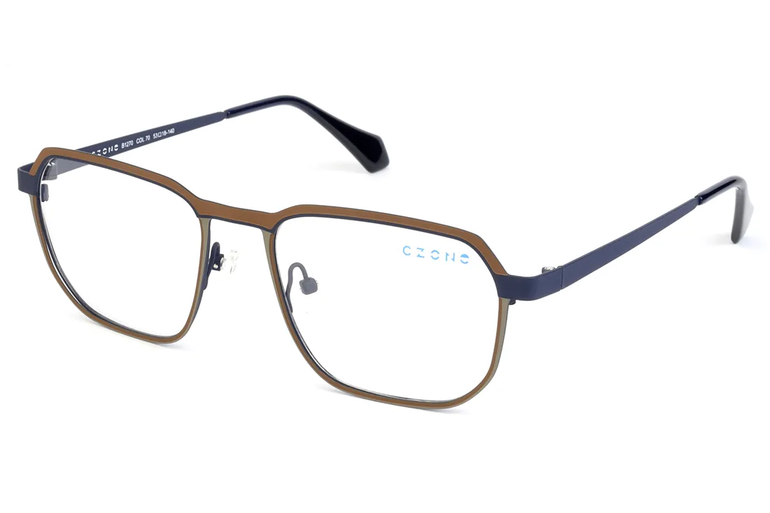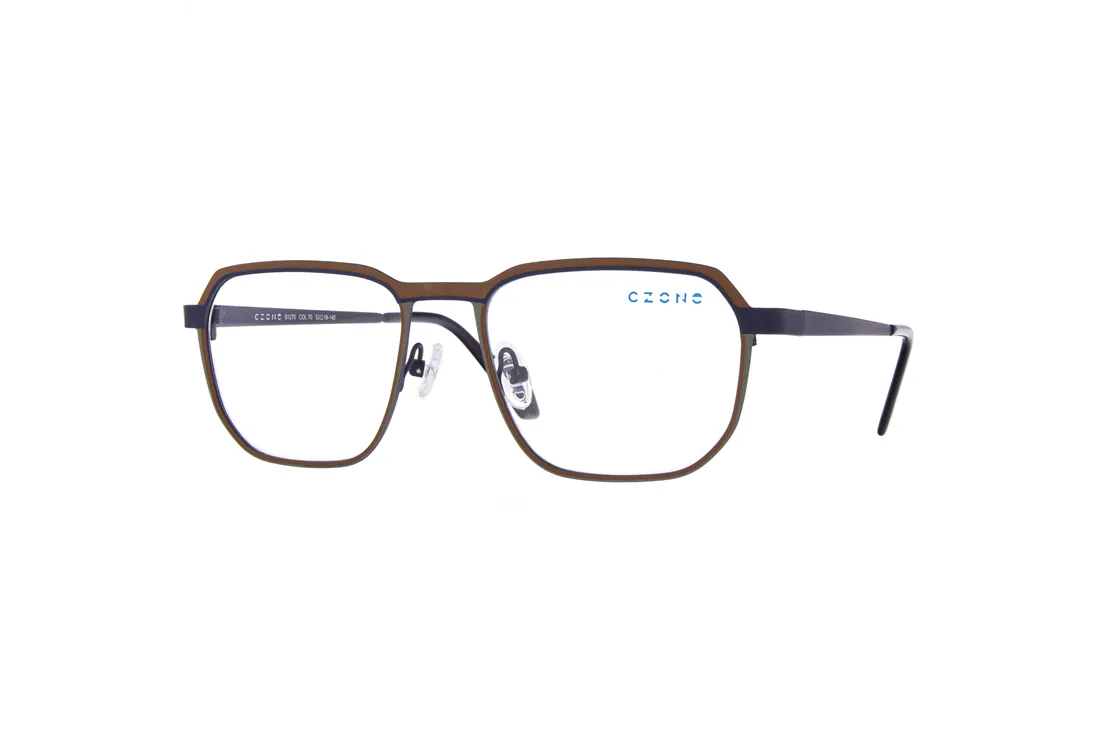 The C-zone eyewear is a geometrically designed optical frame tailored for men, offering exceptional durability and long lifespan thanks to its stainless steel front section. The elegant combination of brown and gray tones, along with the harmonious blend of black and blue temples, provides a modern yet understated appearance that seamlessly complements any style.