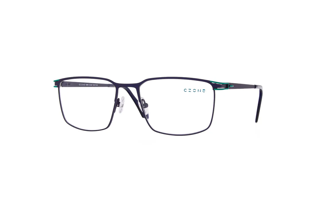 The C-zone eyewear, specifically designed for men, embodies contemporary fashion with its angular design and clean lines. The front frame is crafted from stainless steel, providing not only lightweight comfort but also long-term resistance to the wear and tear of daily use. The blue frame combined with blue-green tinted temples imparts a fresh and youthful energy to the overall appearance, making it an ideal choice for optical retailers aiming to satisfy trend-conscious customers.