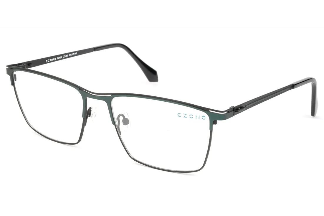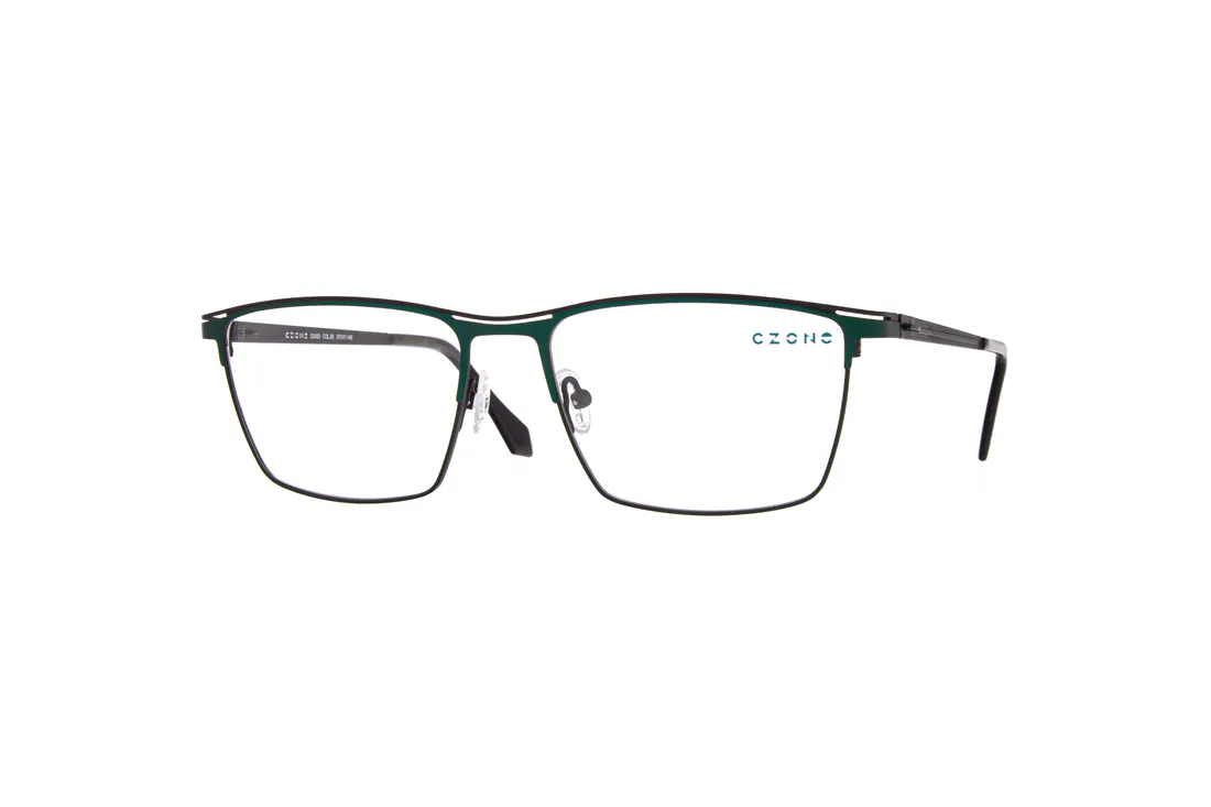 The C-zone eyewear features a refined, angular design crafted specifically for the modern man. The front frame is made of stainless steel, ensuring exceptional durability and long-lasting performance, while the black and green color combination imparts an elegant yet fresh appearance. The full-rim construction provides stability and facilitates the easy insertion of various prescription lenses, making it an ideal choice for optical retailers.