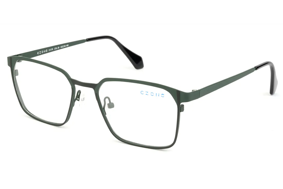 The C-zone eyewear is a high-quality optical frame designed specifically for men, offering exceptional durability and stability thanks to its stainless steel front. Its geometric design imparts a modern appearance, while the harmonious color combination of the green front and black-green temples creates an elegant yet youthful style. The full-rim construction ensures secure lens placement, making it an ideal choice for prescription lenses.