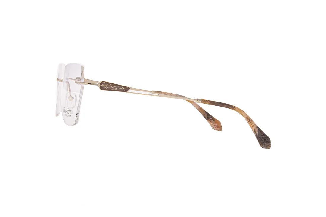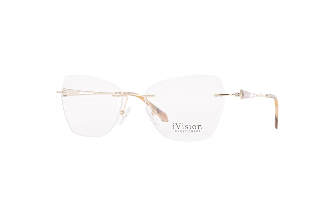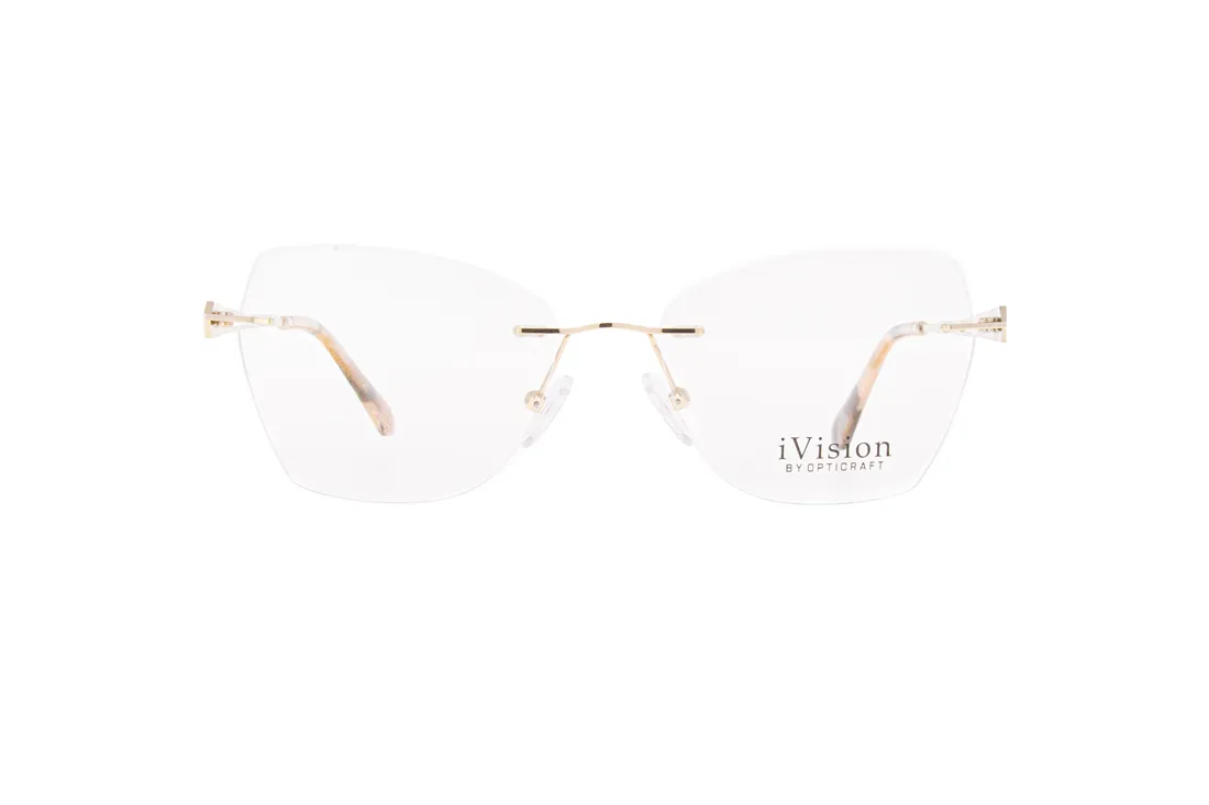 The Ivision eyewear features an elegant, rimless women's optical frame that perfectly combines contemporary fashion with functionality. The metal front piece, finished in a refined gold tone, imparts a sophisticated appearance, while the geometric design offers a distinctive style for the wearer. The rimless construction not only enhances aesthetics but also provides a wider field of vision and comfortable wear, making it an ideal choice for everyday use.