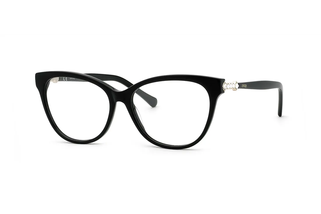 The Opera women's eyeglasses feature a black, rounded plastic front frame that ensures durability and lightweight comfort. The black temples provide an elegant appearance, while the frame is highly suitable for various optical lenses. The temples are further enhanced by exquisite gemstone embellishments, adding a distinctive touch.