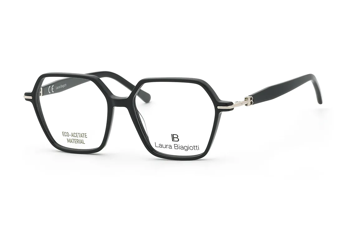 The Laura Biagiotti eyewear features an elegant, women's geometric-shaped optical frame that combines the brand's refined style with reliability. The front is crafted from high-quality black plastic, offering not only an aesthetic appeal but also exceptional durability, ensuring the frame maintains its original appearance and structural integrity over time. The black temples complement the frame harmoniously, providing a modern yet timeless look for the wearer.