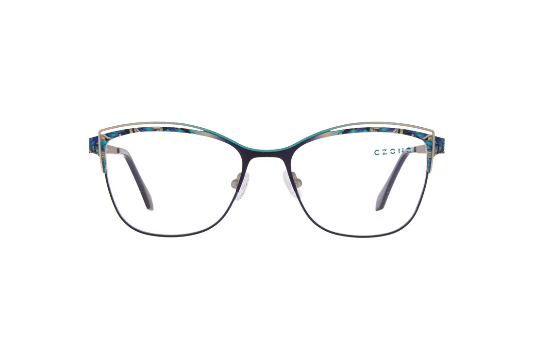 The C-Zone eyewear represents a refined balance between modern women’s fashion and functionality. The stainless steel front piece, featuring a blue hue and rounded shape, offers an elegant yet fresh appearance that seamlessly complements any facial structure. The full-rim design provides stability and reliability, while the distinctive pattern on the silver and blue temples imparts a unique character to the glasses.