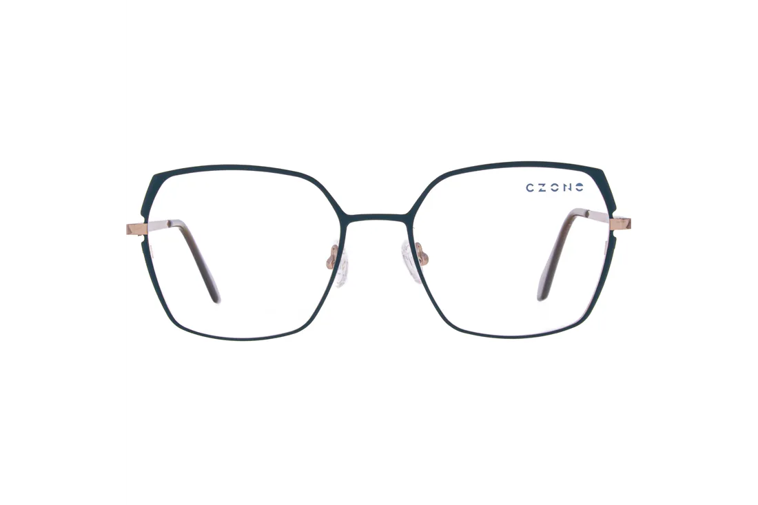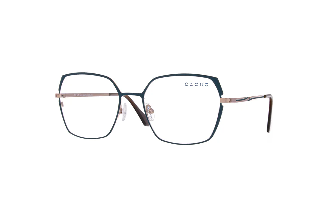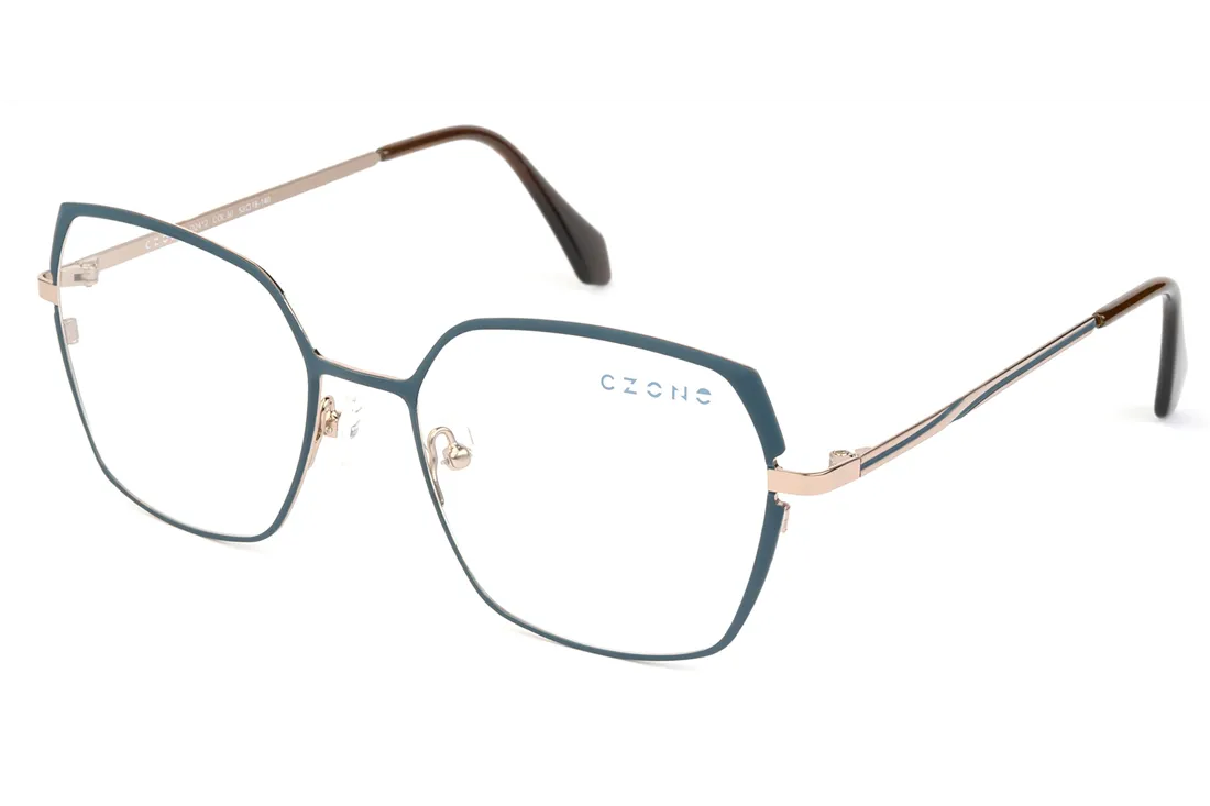 The C-zone eyewear offers a sophisticated, modern aesthetic designed specifically to meet the needs of female customers. The front frame is crafted from stainless steel, ensuring not only lightweight comfort but also exceptional durability for long-term use. The blue geometric shape imparts a unique character to the glasses, while the brown and rose gold temples create an elegant contrast, highlighting fashionable details.