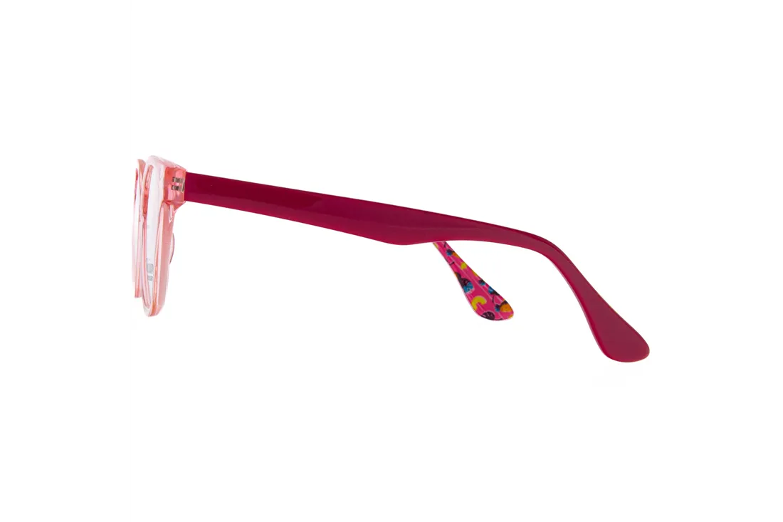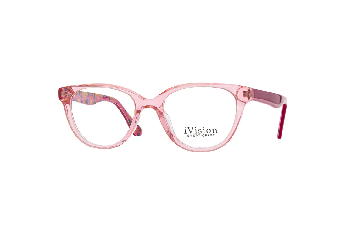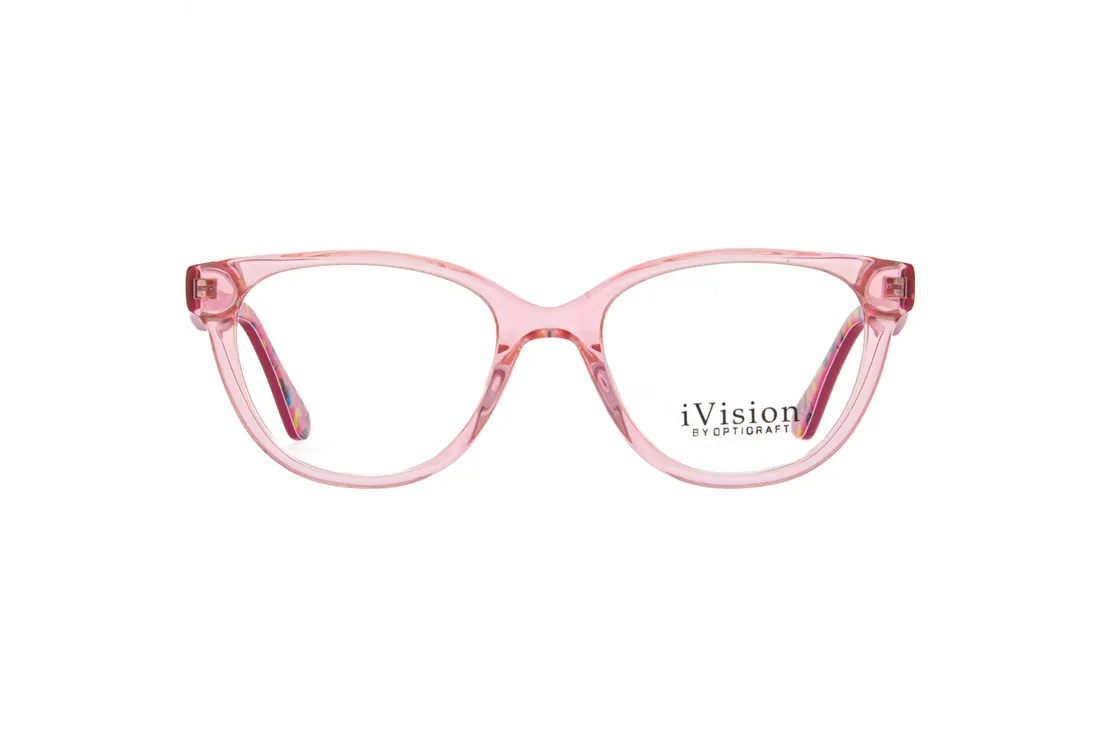 Az Ivision by Opticraft gyermek szemüveg teljes keretes kialakítású, rózsaszín áttetsző műanyag frontrésszel és harmonizáló szárakkal, amely tartósságot és kényelmet biztosít a fiatal viselők számára. Lekerekített formája ergonomikus illeszkedést tesz lehetővé, miközben a keret széles körben kompatibilis különféle lencsetípusokkal. A szár belső oldalán található mintázat egyedi megjelenést kölcsönöz a terméknek.
