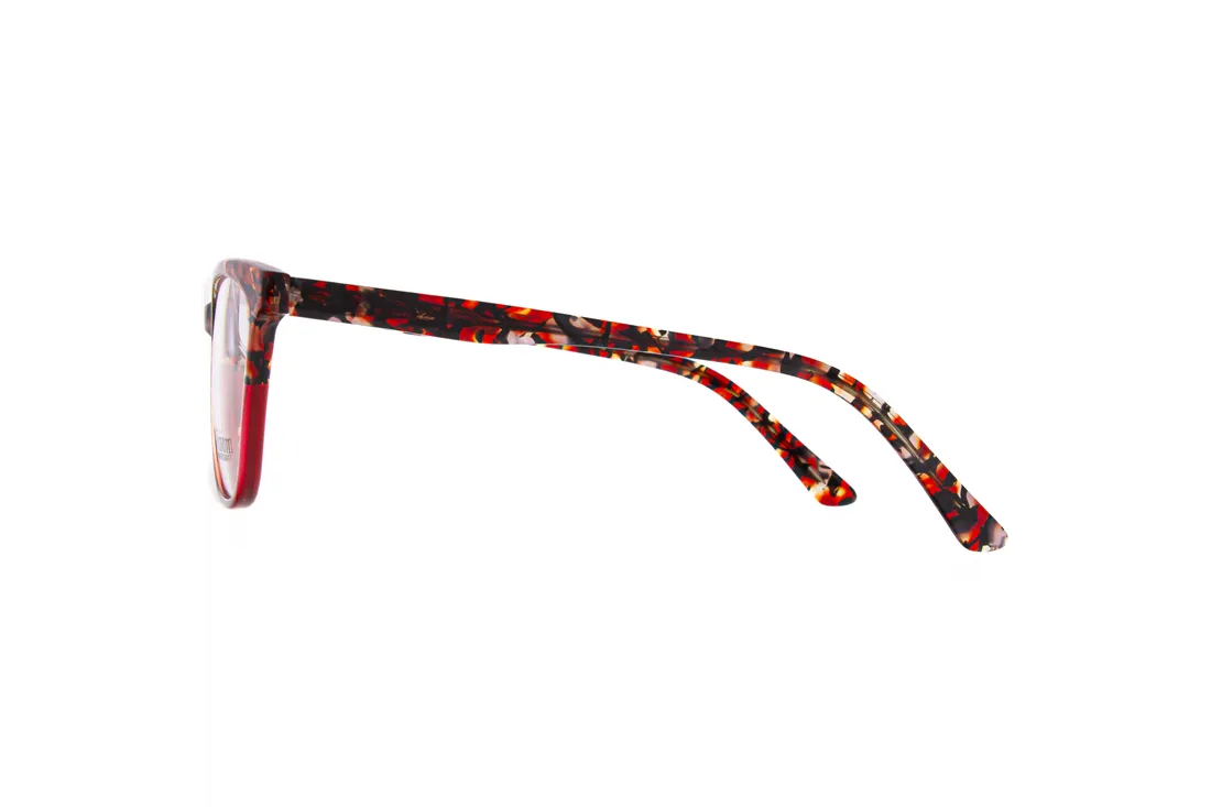 A szemüveg szárai szintén fekete-piros kombinációban készültek, ami harmonikus megjelenést kölcsönöz. A minőségi anyaghasználat és a gondos kidolgozás garantálja a tartósságot és a stabil illeszkedést. Ez a modell nemcsak divatos, hanem praktikus is, így ideális választás mindennapi használatra.