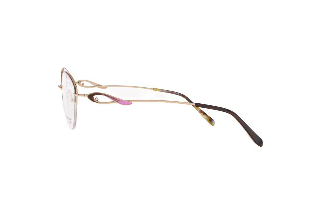 A fél keretes kialakítás modern és légies hatást kelt, miközben biztosítja a szemüveg stabilitását. A finoman ívelt szárak különleges, elegáns részletekkel díszítettek, amelyek egyedivé teszik a megjelenést. A híd és a keret arányai harmonikusak, így a szemüveg kényelmes viseletet garantál egész napra.