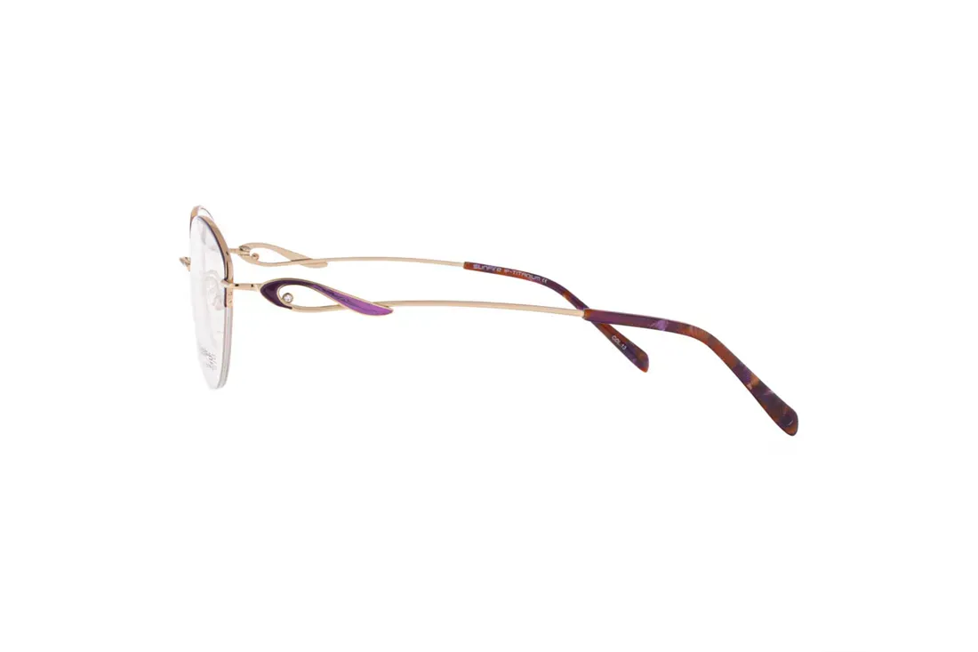 A fél keretes kialakítás modern és légies hatást kelt, miközben a szemüveg stabilitását is megőrzi. A finom, aranyszínű szárak különleges, hullámzó díszítéssel rendelkeznek, ami egyedi karaktert ad a szemüvegnek. A párnázott orrtámaszok segítik a tökéletes illeszkedést, így a szemüveg nem csúszik és nem nyom.