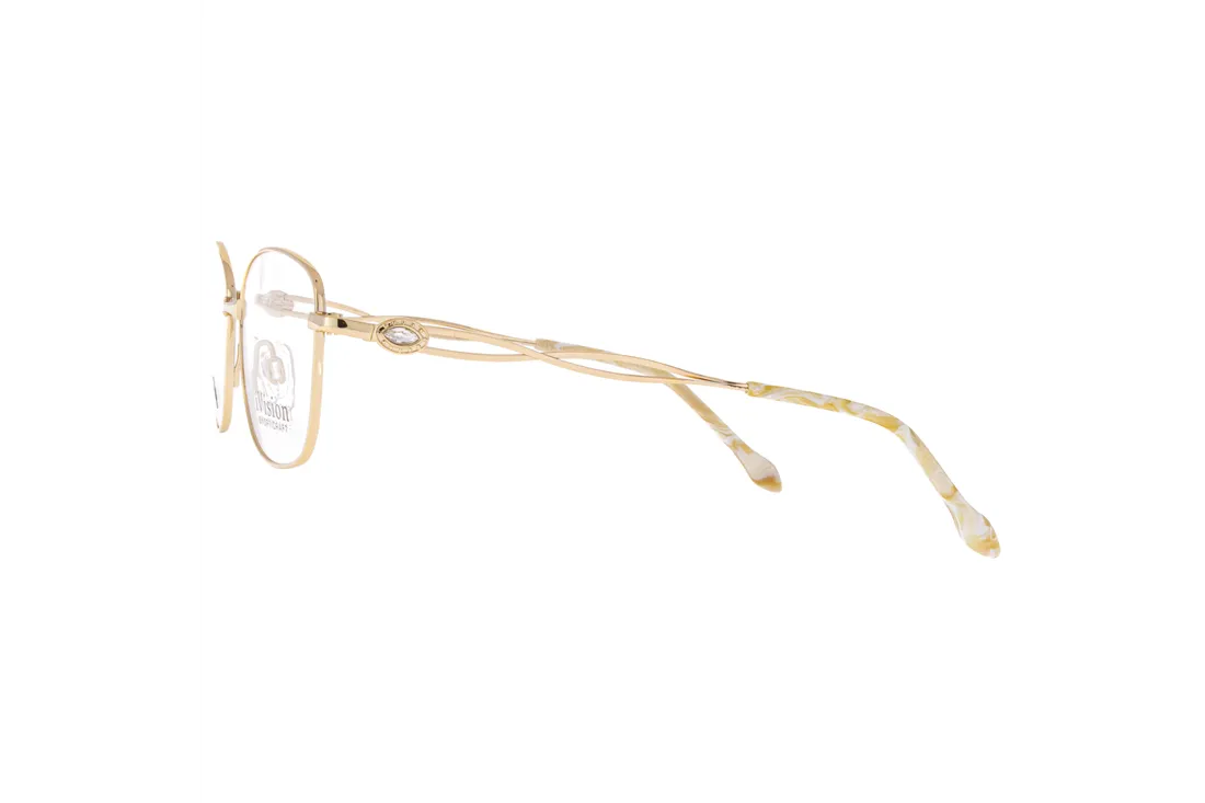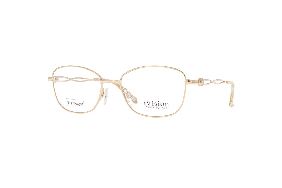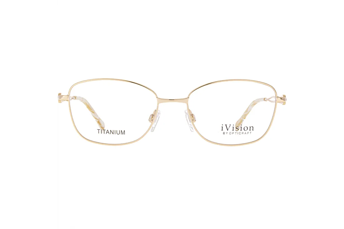 Az Ivision márka női szemüvegkerete a titánium frontrész anyagának köszönhetően kiemelkedő tartósságot és könnyedséget biztosít, amely hosszú távon is megőrzi formáját és stabilitását. Az arany színű, lekerekített formavilág elegáns és modern megjelenést kölcsönöz, amely harmonikusan illeszkedik különféle arcformákhoz, így széles vásárlói kör számára vonzó választás.